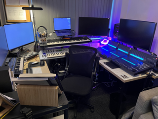 I write, compose, drum and produce a majority of my tracks solo in my spare time across two pre-production studios (so Vocals, Drumming and Keyboards can be recorded) in my hometown in Hertfordshire.